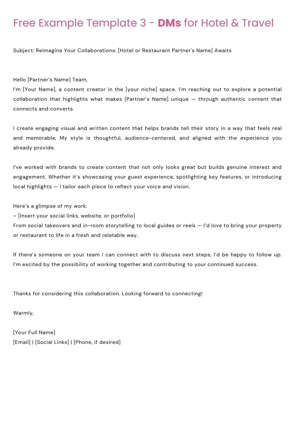 We’ll create a custom media kit together and you’ll get access to my library of media kit templates, plus 10+ DM/email pitch templates proven to land collabs. I’ll also share my list of 200+ hotels & PR/social media contacts — so you’re reaching out to hotels that already say yes to creators.