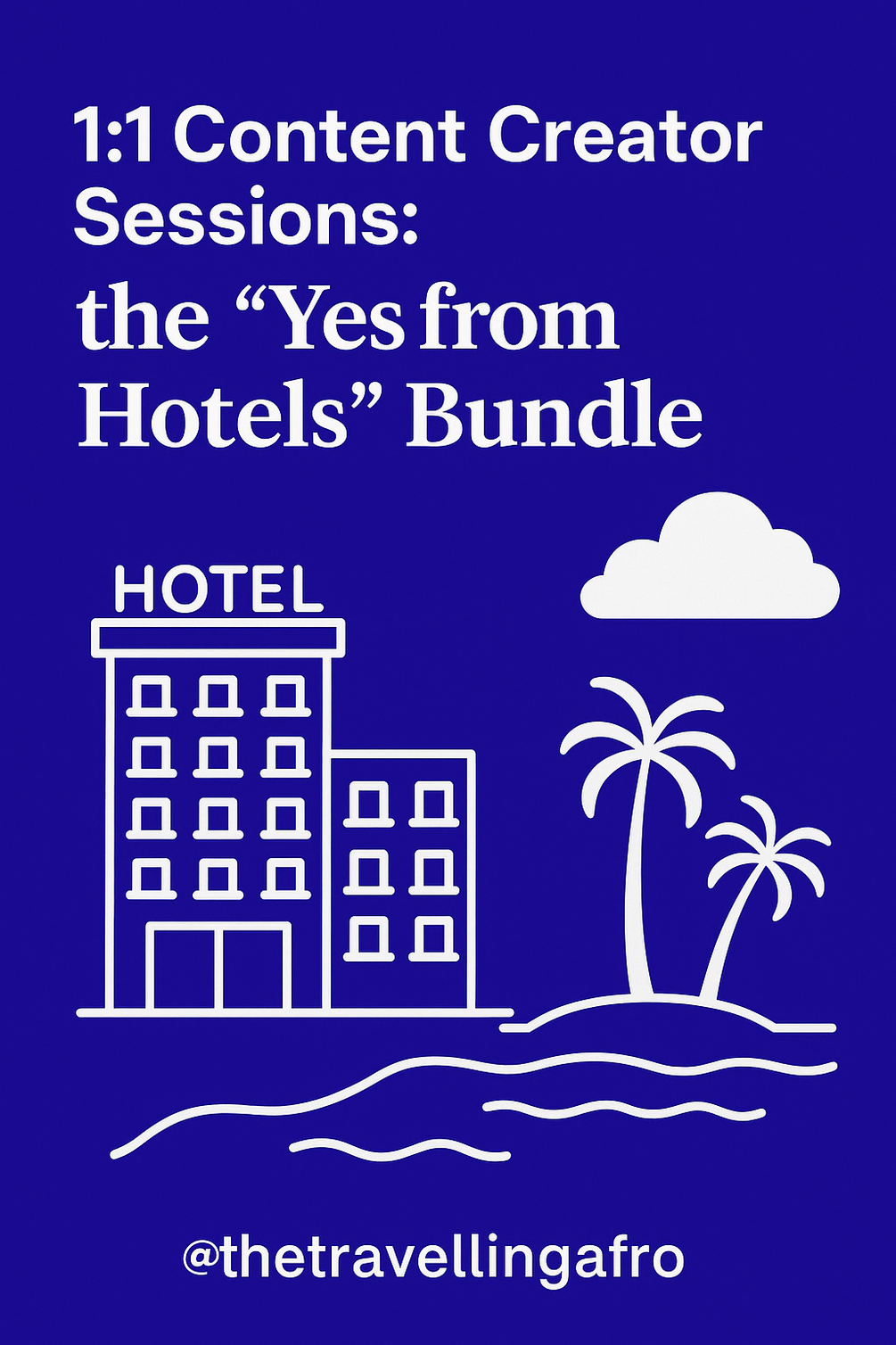 In 4 private 90-minute sessions, I’ll revamp your socials, share my proven hotel pitch strategy with 200+ contacts, and give you media kit templates, pitch scripts, and lifetime access to my “Yes from Hotels” bundle.
